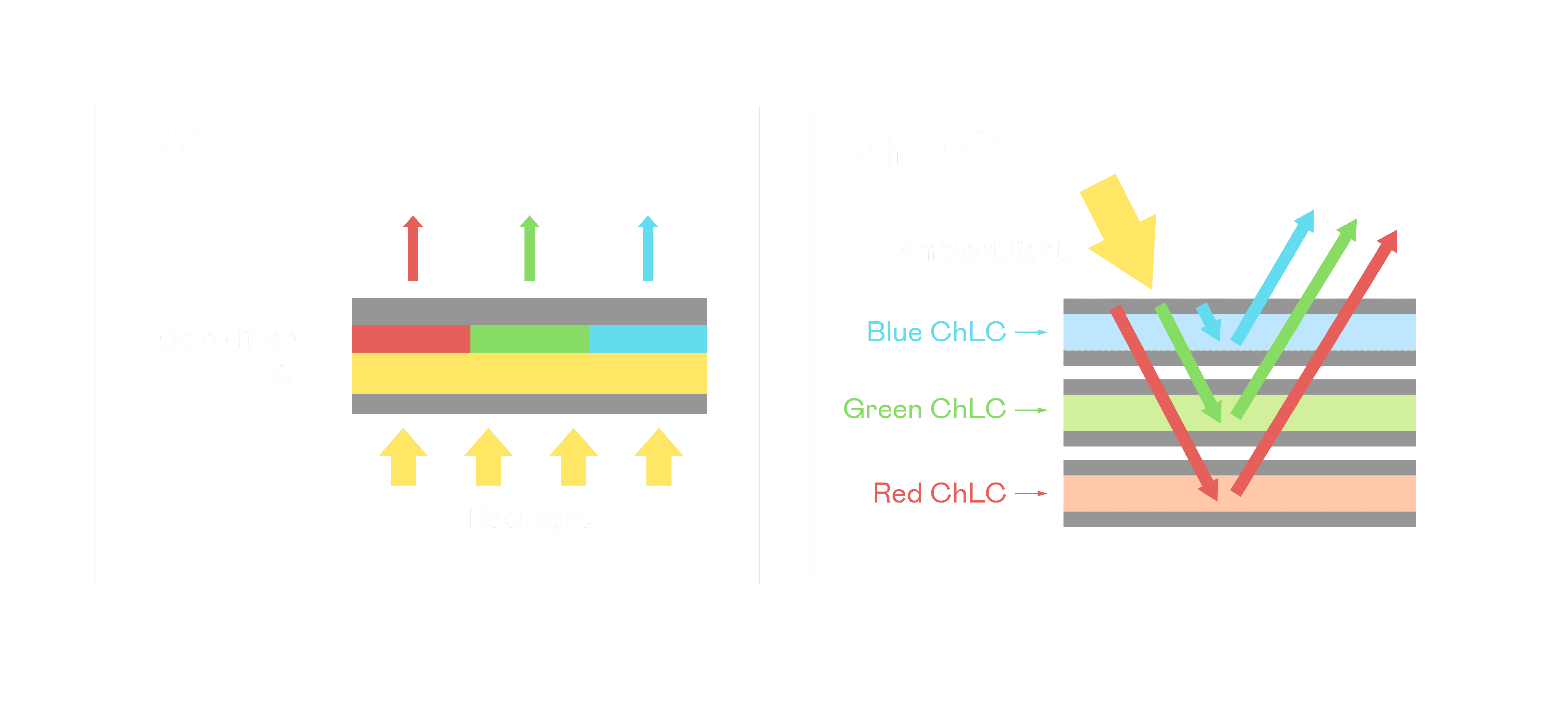 ChLCD 胆固醇液晶就如同纸张一样,,,,透过反射环境光来显示影像,,,因此长时间观看不易造成人眼视觉疲劳,,,,可达到护眼效果。。。当处于户外阳光下使用,,LCD 影像容易失真而不易观看,,,但胆固醇液晶仍可维持较佳的影像品质。。