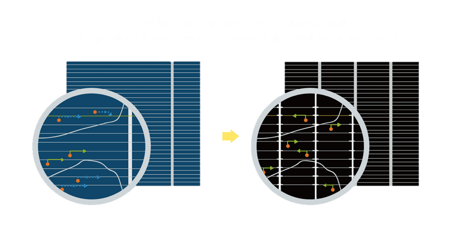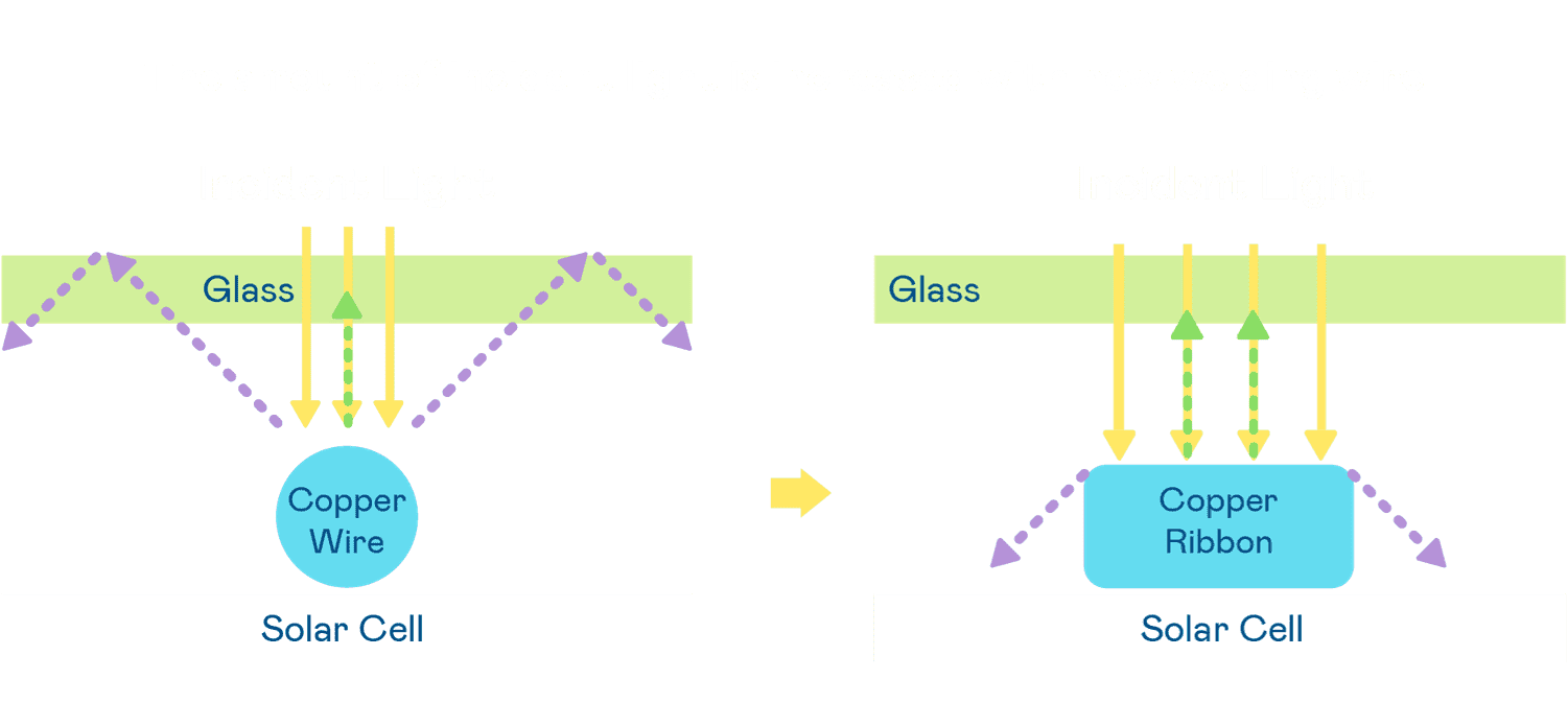 - 电池使用多条铜导线 (Copper wire) 于电池片上形成较短的电流路径,,提高电流收集效率,,,,采用圆形设计的铜导线较传统扁平式的铜焊带 (Ribbon),,可增加入射至电池的光线量。。