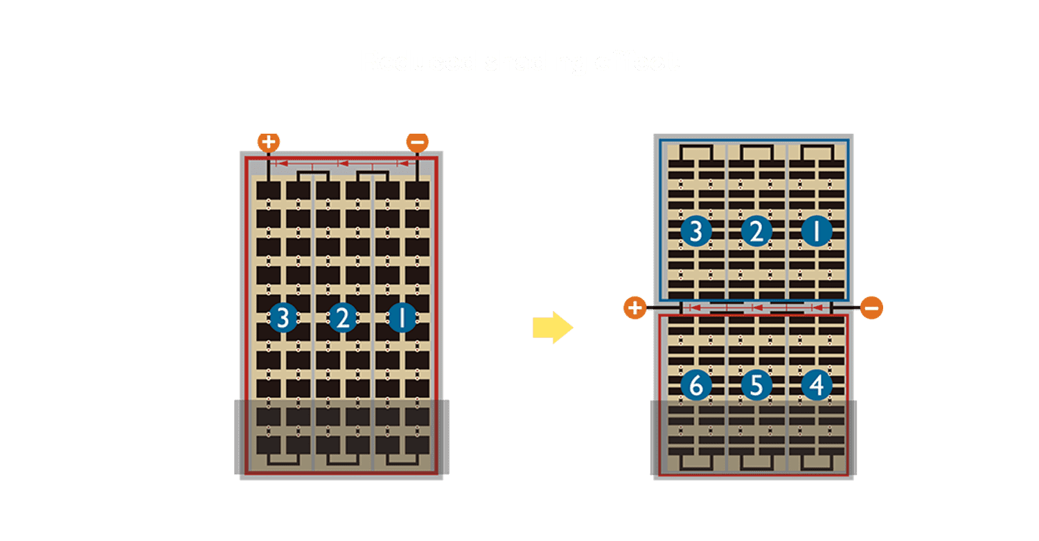 - 结合半切电池,,降低遮阴影响、、、、提升模组抗隐裂能力、、并减少电阻损耗,,,进一步提升模组发电效能。。